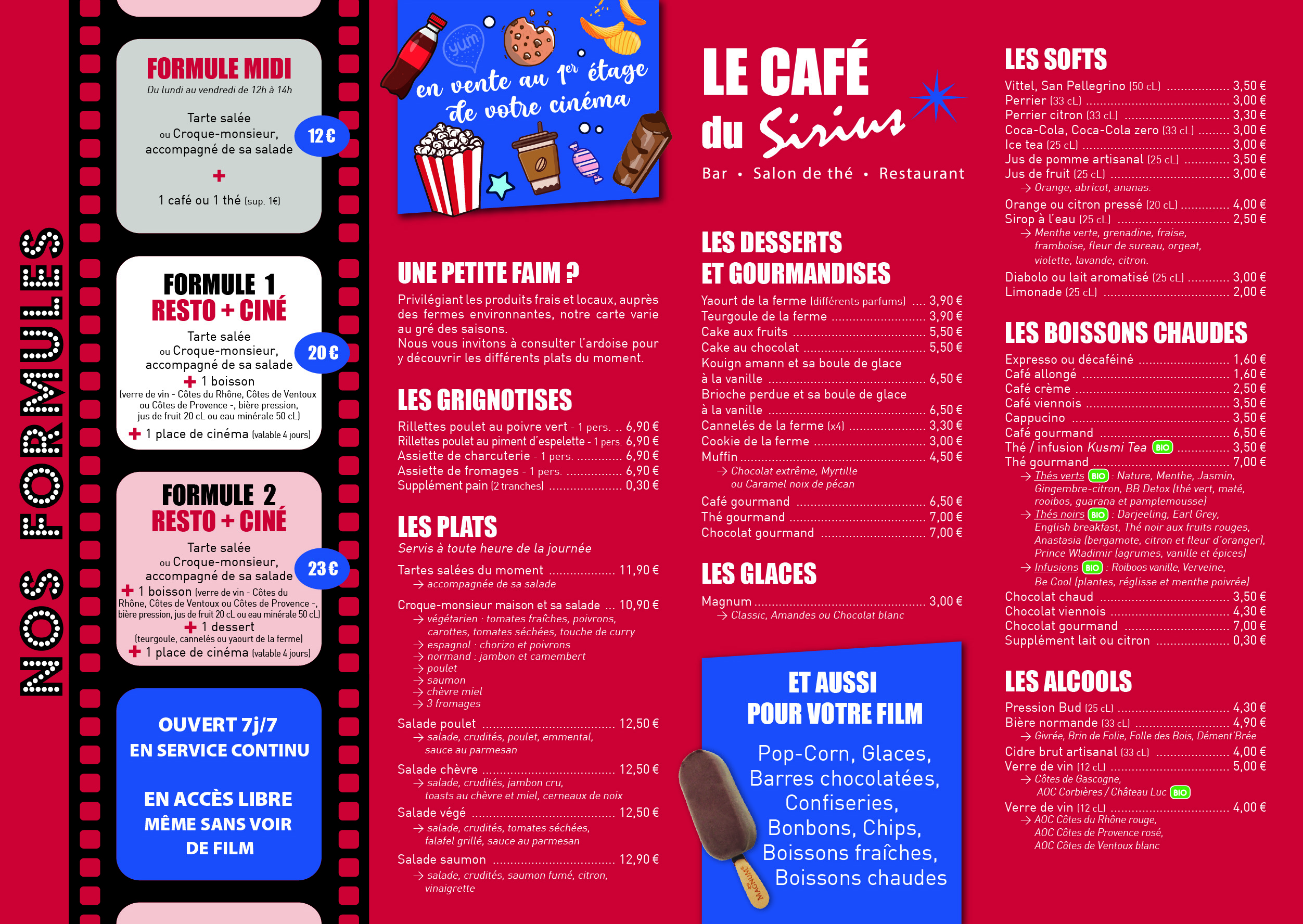 Ouvert 7 jours sur 7 (de 12h à 21h en semaine et de 13h30 à 21h le week-end), nous vous accueillons pour manger ou prendre un verre selon votre envie. Les repas sont servis à toute heure de la journée et notre café est ouvert à tous, que vous alliez voir un film ou non.